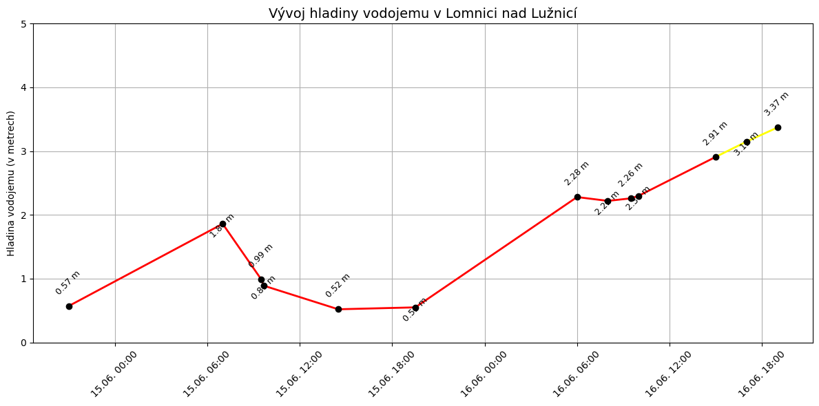 Červená čára označuje hladinu do 2,5 m, žlutá čára pak hodnoty nad touto hranicí.