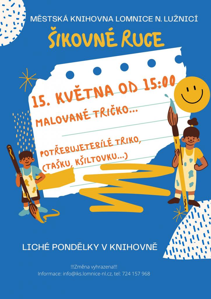 V pondělí 15. května od 15:00 hodin budeme s dětmi od 5 let malovat trička (případně kšiltovku, tašku). Potřebujete bílé bavlněné triko nebo jiný textilní materiál.